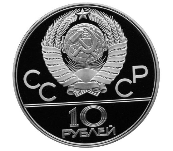 Инвестиционная монета СССР, выпущенная в 1977 году к «Олимпиаде-80». Эмблема Олимпийских игр 1980-го года представляет собой 5 тянущихся кверху лучей, увенчанных пятиконечной звездой. Лучи стоят на 5-ти олимпийских кольцах. Композиция изображена на фоне карты СССР.