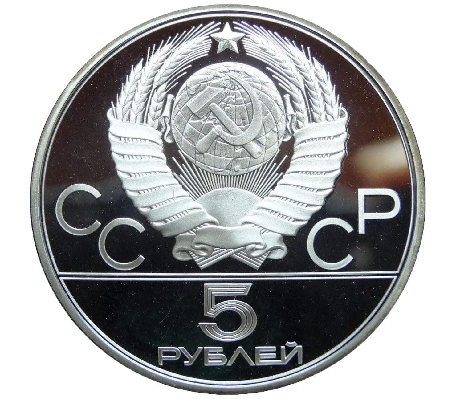 Аверс монеты: рельефное изображение Герба Советского Союза в центральной и верхней части диска. Ниже указан номинал «5 рублей». Реверс: фигура гимнастки, выполняющей акробатический элемент. Фоном служит изображение фасада ледового дворца имени Ленина.