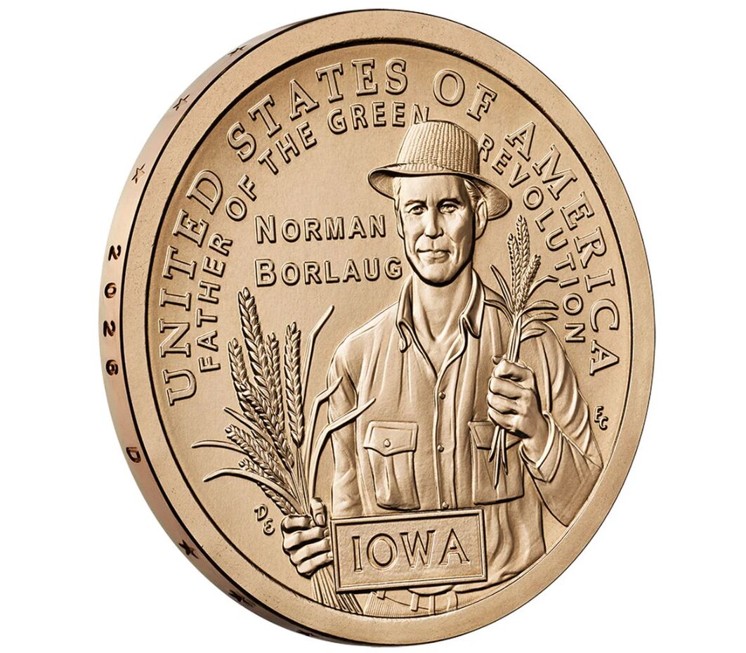 На оборотной стороне долларовой монеты из серии «Американские инновации», посвященной Айове, изображен доктор Норман Борлауг, держащий сноп пшеницы и колосья, что подчеркивает его новаторскую работу по разработке устойчивых сельскохозяйственных культур, способных прокормить растущее население планеты.