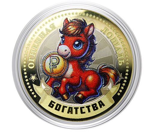 За основу взята оригинальная монета. Изображение нанесено методом лазерной гравировки. Монета с объемной заливкой поверх эмали. Сувенирная продукция, поставляется в открытке и капсуле.