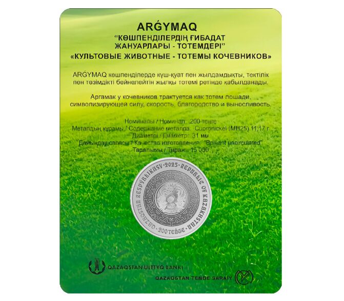 Монета 200 тенге 2025 «Культовые животные — тотемы кочевников — лошадь Аргамак» Казахстан (в блистере)