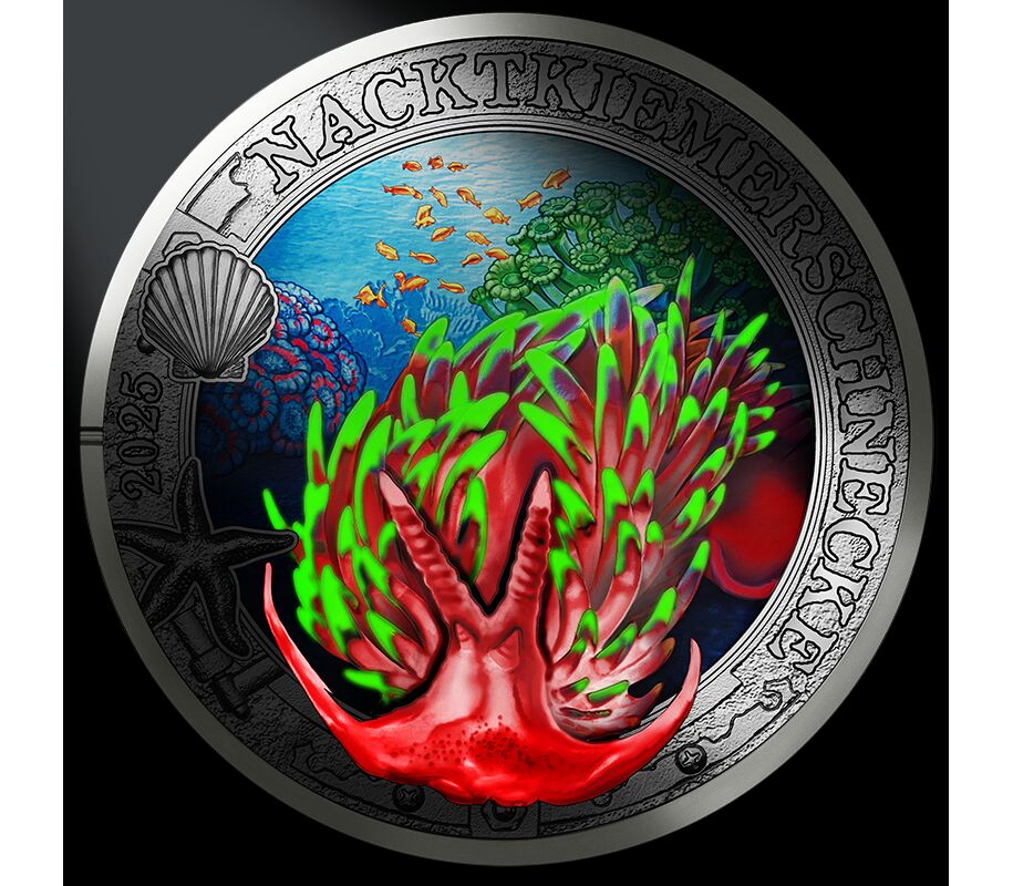 На одиннадцатой монете достоинством 3 евро из серии «Светящиеся морские миры» изображен голожаберный моллюск, чьи цвета меняются под воздействием ультрафиолета.