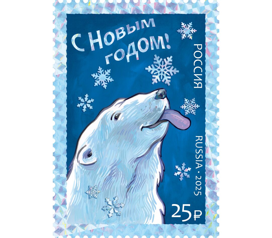 Новогодняя марка 2025 года. На марке изображен белый мишка, который ловит снежинки. Данный дизайн был выбран в качестве победителя среди 350 конкурсных работ, присланных со всей страны.