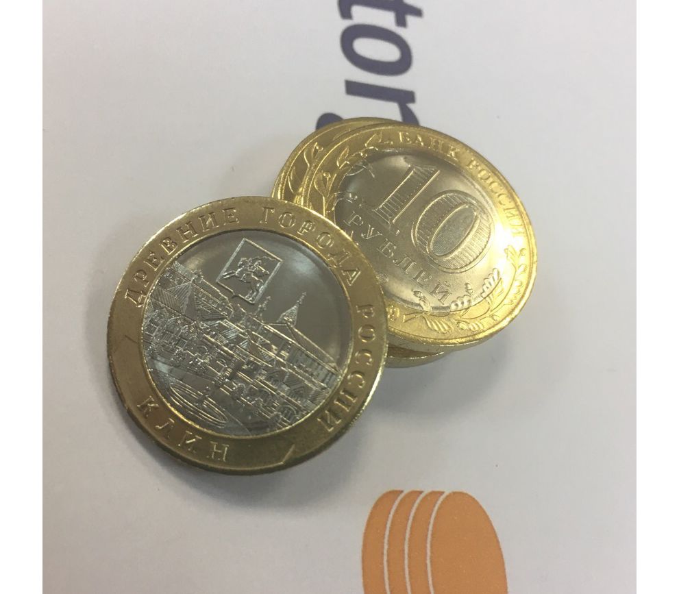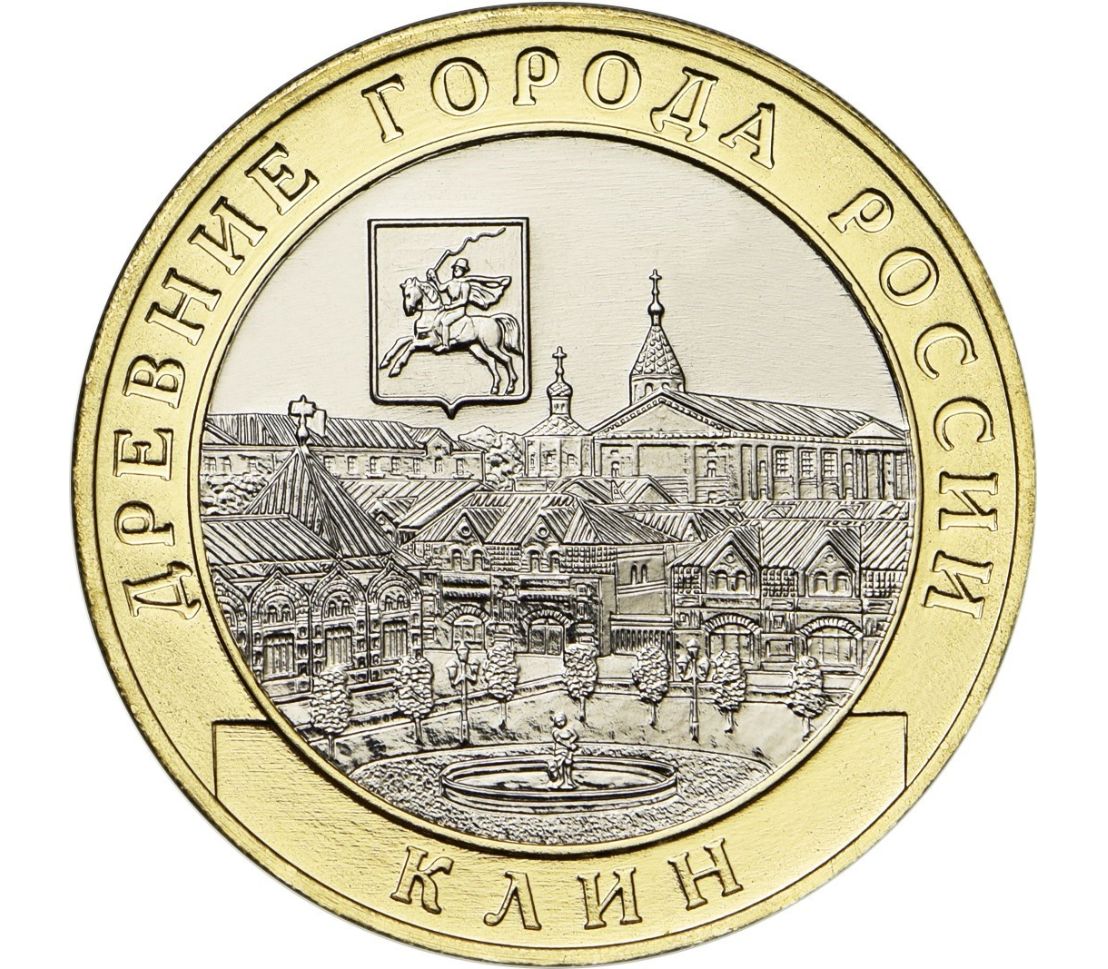 Монета 2019 года из серии «Древние города России» посвящена Клину — городу, расположенному в Московской области и заложенному в 1317 году. На реверсе монеты размещена панорама древнего Клина и изображен герб города.