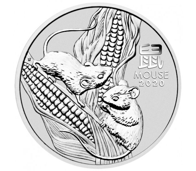 Монета, посвященная главному символу 2020 года по Восточному Гороскопу — мышке (или крысе). На реверсе монеты изображены два мышонка, сидящие на початках кукурузы.